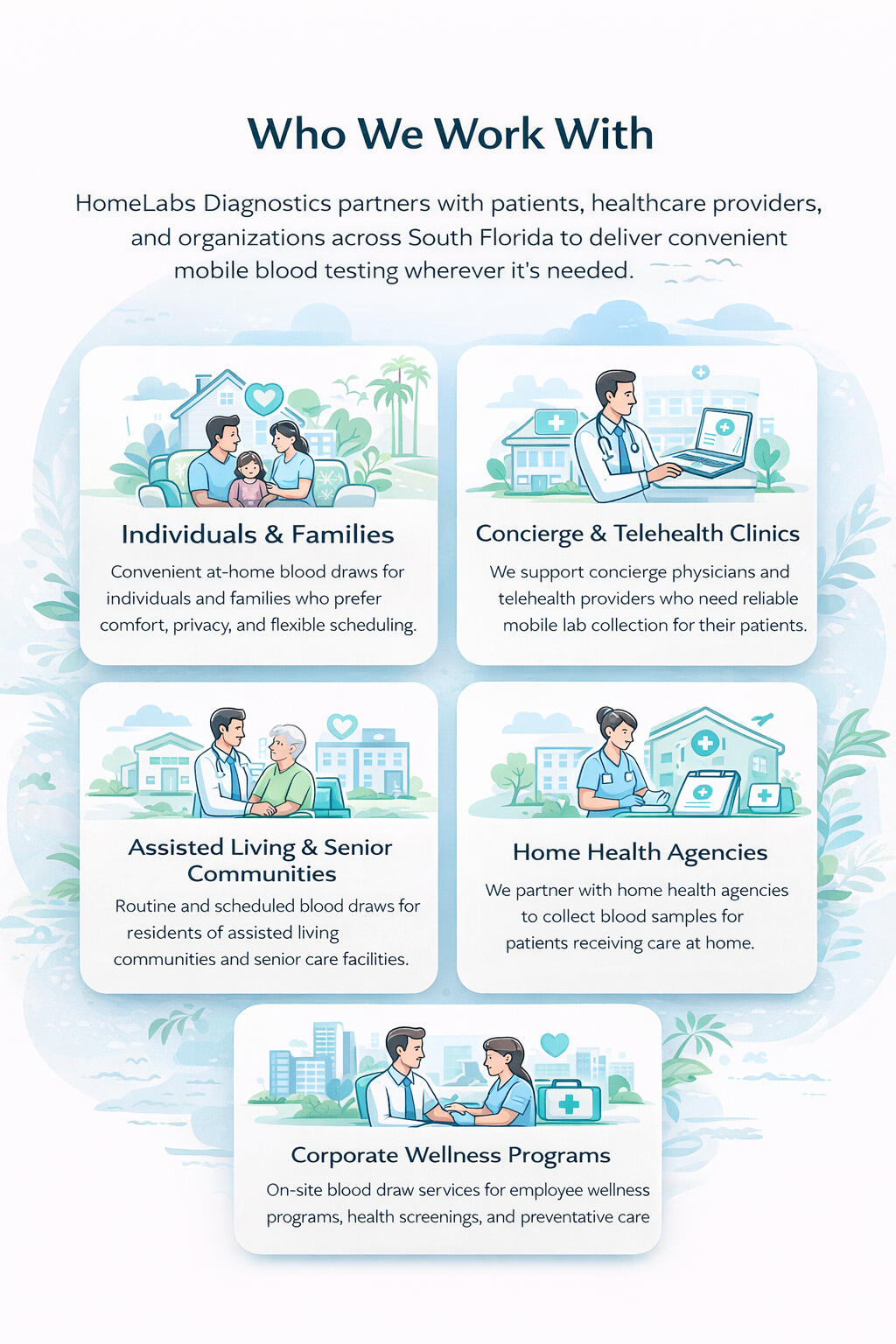 Q1: Do you accept insurance?A: We are currently a self-pay service. We can provide an itemized receipt that you may submit to your insurance, HSA, or FSA for possible reimbursement — coverage depends on your plan.Q2: How much does a visit cost?A: Pricing varies based on location and timing. Most home visits fall within a transparent range. After you submit a request, we’ll provide accurate pricing before scheduling.Q3: What areas do you serve?A: We provide mobile phlebotomy and diagnostic services throughout South Florida, including Miami-Dade and Broward Counties. Additional areas may be available by request.Q4: Are your phlebotomists certified?A: Yes. All Homelabs Diagnostics providers are certified, trained professionals who follow strict safety and sanitation protocols.Q5: How long does a visit take?A: Most visits take 15–30 minutes depending on the number and type of tests being collected. We recommend allowing a 45-minute window in case of traffic.Q6: Do you perform tests at home or labs?A: Our team collects specimens at your chosen location. Samples are then transported to a partnered laboratory for processing on the same day.Q7: Can I request a specific time?A: Yes! When booking online, you’ll select your preferred date and time window. We’ll confirm the closest available appointment.