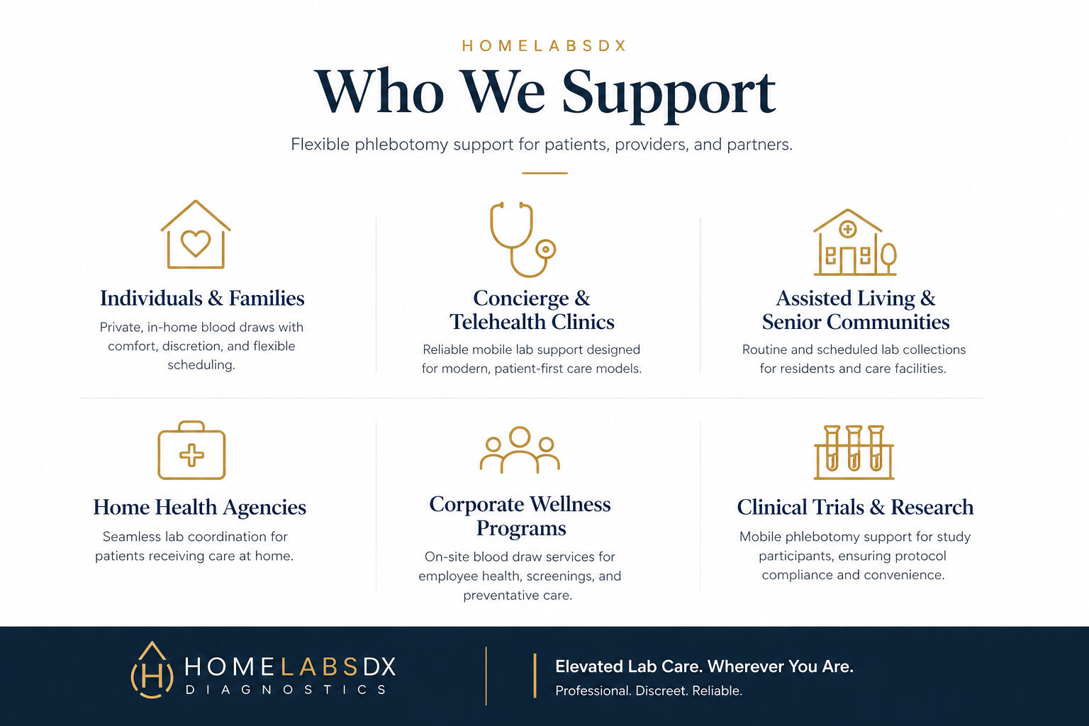 © 2026 HomeLabs Diagnostics. All rights reserved.HomeLabs Diagnostics provides mobile specimen collection services only and does not provide medical advice, diagnosis, or treatment. Laboratory testing is performed by certified third-party laboratories such as Quest Diagnostics or LabCorp.Service availability may vary by location. Please contact us for scheduling details.Privacy Policy | Terms of Service